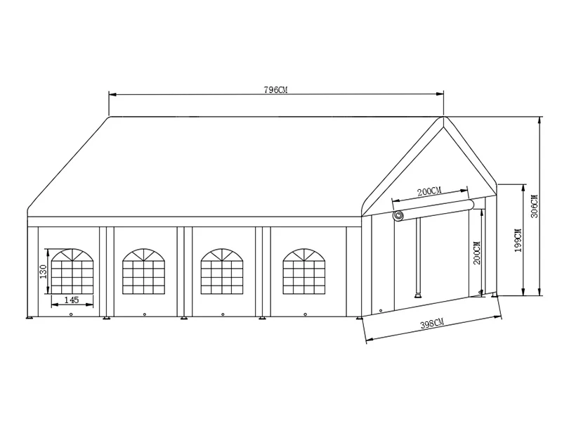 - Stora uppfällbara dörrar i båda ändarna av tältet