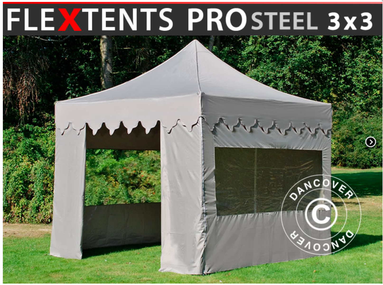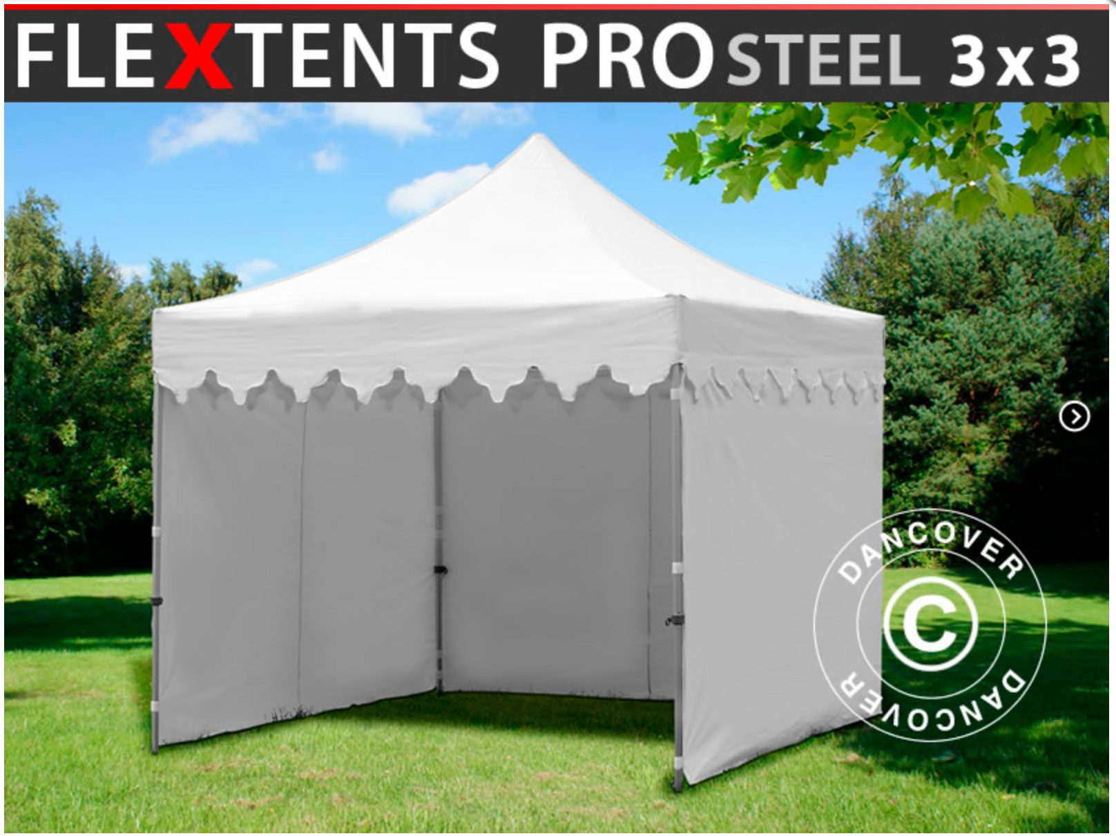 Snabbtält FleXtents PRO Steel är ett högkvalitativt snabbtält. Den kombinerar funktionell elegant design med professionell kvalitet. FleXtents PRO Steel är extremt lätt att installera, transportera och lagra.