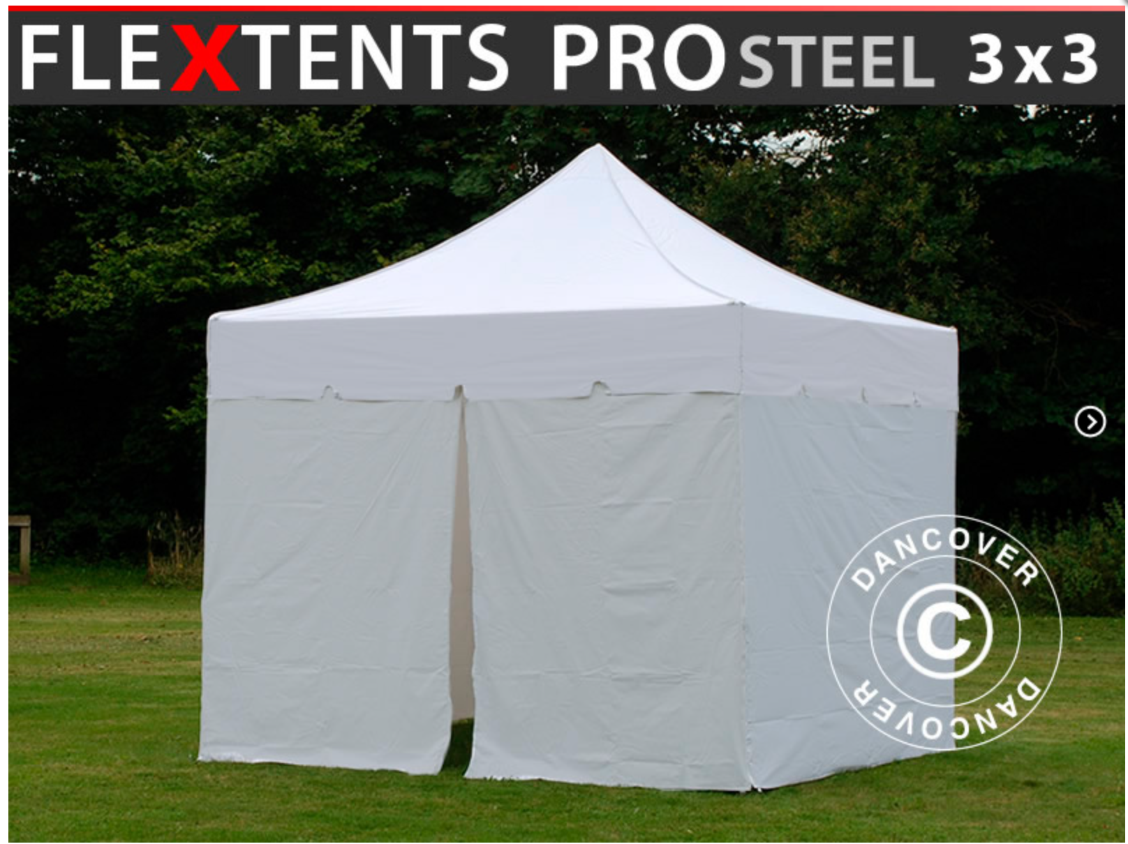 Snabbtält FleXtents PRO Steel är ett högkvalitativt snabbtält. Den kombinerar funktionell elegant design med professionell kvalitet. FleXtents PRO Steel är extremt lätt att installera, transportera och lagra.