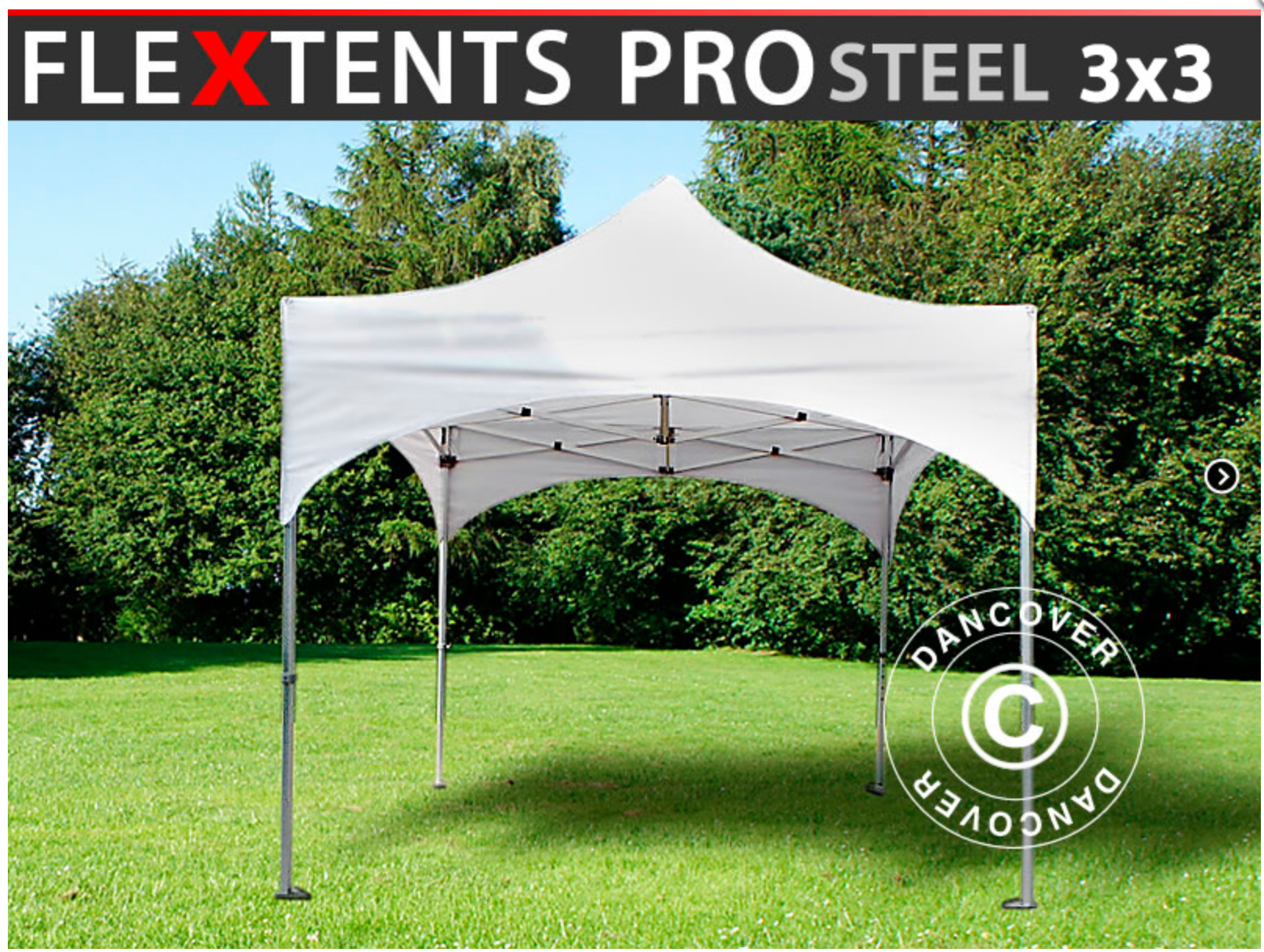 Snabbtält FleXtents PRO Steel är ett högkvalitativt snabbtält. Den kombinerar funktionell elegant design med professionell kvalitet. FleXtents PRO Steel är extremt lätt att installera, transportera och lagra.