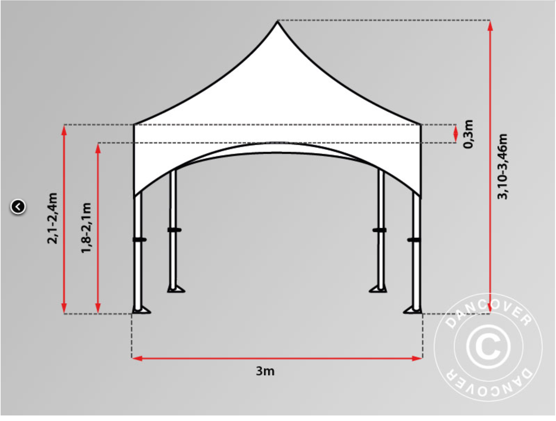 Den starka stålställningen är tillverkad av tunga sexkantiga rör för maximal styrka och hållbarhet. De stora fotplattorna ger stabil och solid förankring vid installation. FleXtents höjd är justerbar med 3 olika positioner, så det passar exakt efter dina behov. Takduken är tillverkad av högkvalitativ stark polyester med PVC-stöd. Takduken är vattentät, UV-resistent, fläckbeständig och tvättbar!