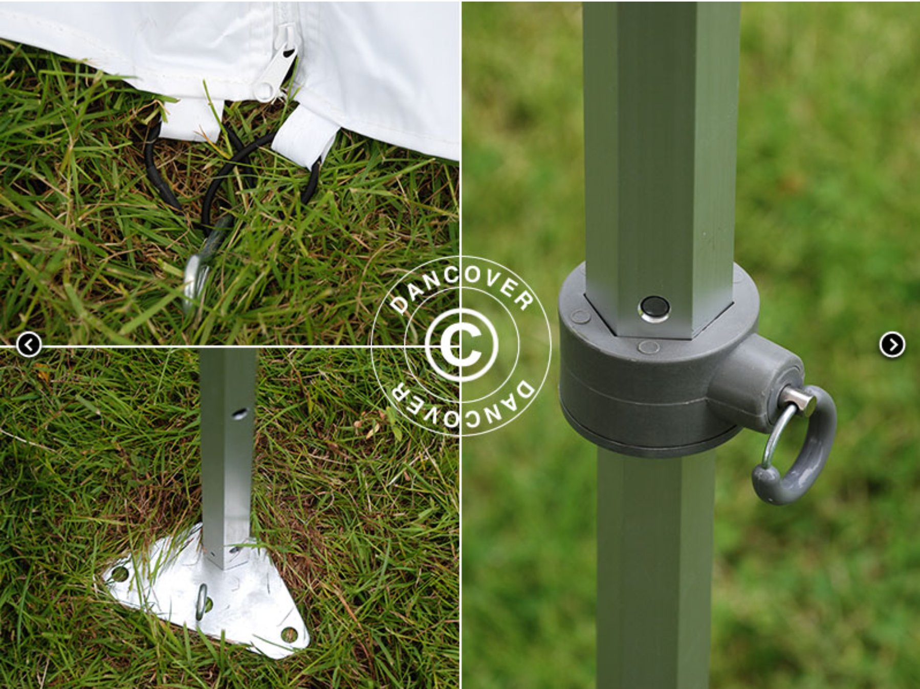 Den starka stålställningen är tillverkad av tunga sexkantiga rör för maximal styrka och hållbarhet. De stora fotplattorna ger stabil och solid förankring vid installation. FleXtents höjd är justerbar med 3 olika positioner, så det passar exakt efter dina behov. Skyddet är tillverkat av stark polyester av hög kvalitet med en kraftig PVC-baksida. Det är vattentätt, UV-resistent, smutsavvisande och tvättbart! Sidoväggarna sitter fast i varandra med dragkedja och är fixerade vid ramen med starka kardborrband.