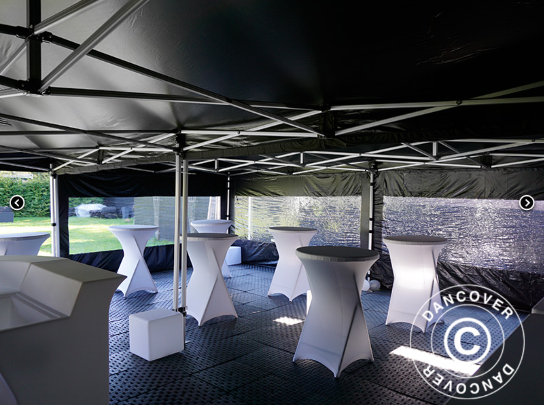 Vi rekommenderar dig att köpa en bottenram, viktdiskar och vårt säkerhetspaket som innehåller stormlinor och tältpinnar anpassade till storm för att öka stabiliteten vid blåsigt väder. Välj sidoväggar i olika färger, halva sidopaneler eller sidoväggar med panoramafönster för att anpassa ditt FleXtents ännu mer och skapa olika intressanta utseende.