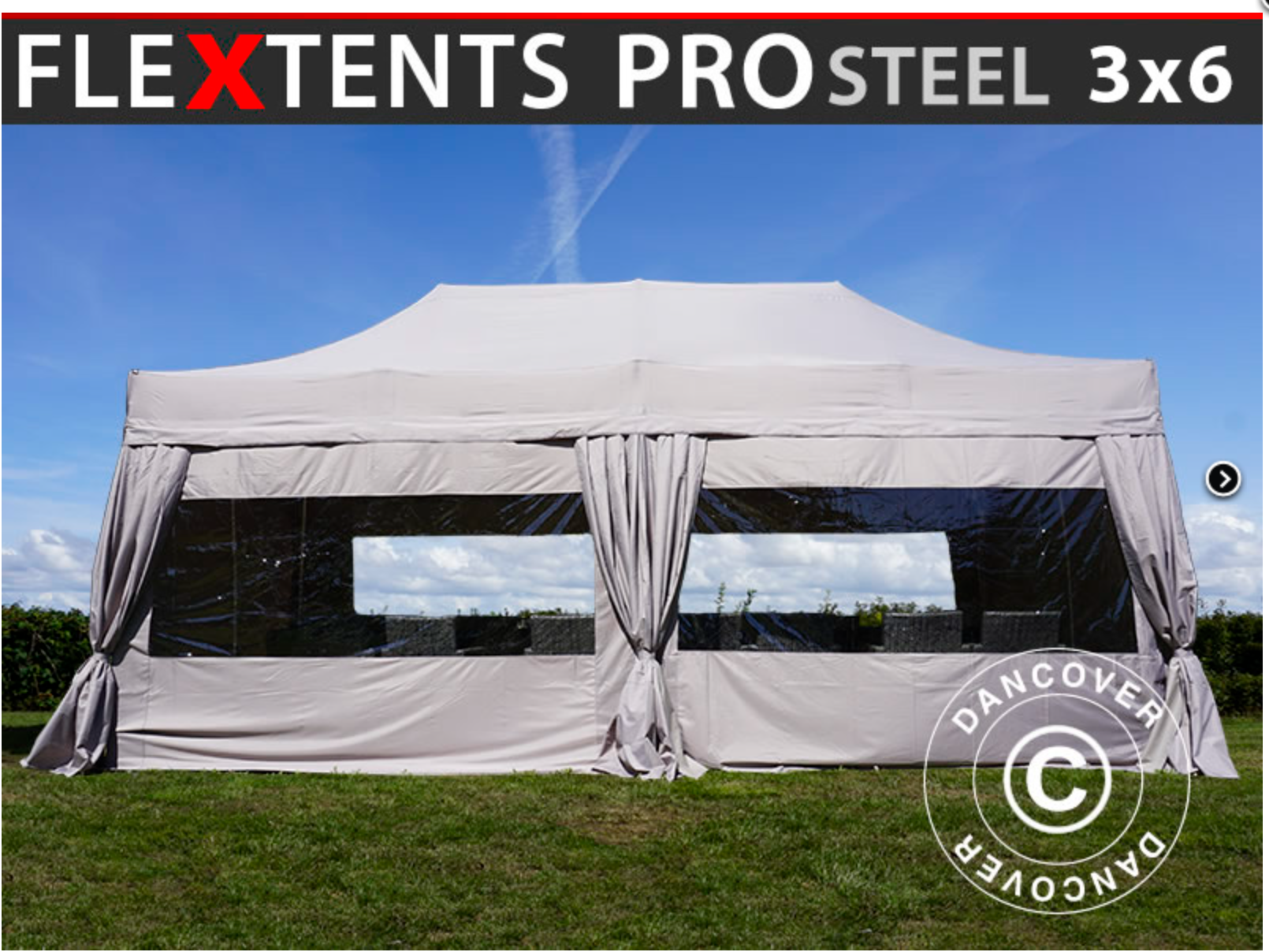 Snabbtält FleXtents PRO Steel är ett högkvalitativt snabbtält. Den kombinerar funktionell elegant design med professionell kvalitet. FleXtents PRO Steel är extremt lätt att installera, transportera och lagra.